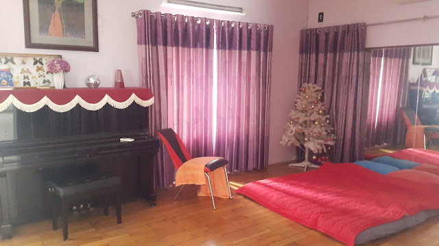 The best part of the house we stayed: wooden floor with mirrored wall.