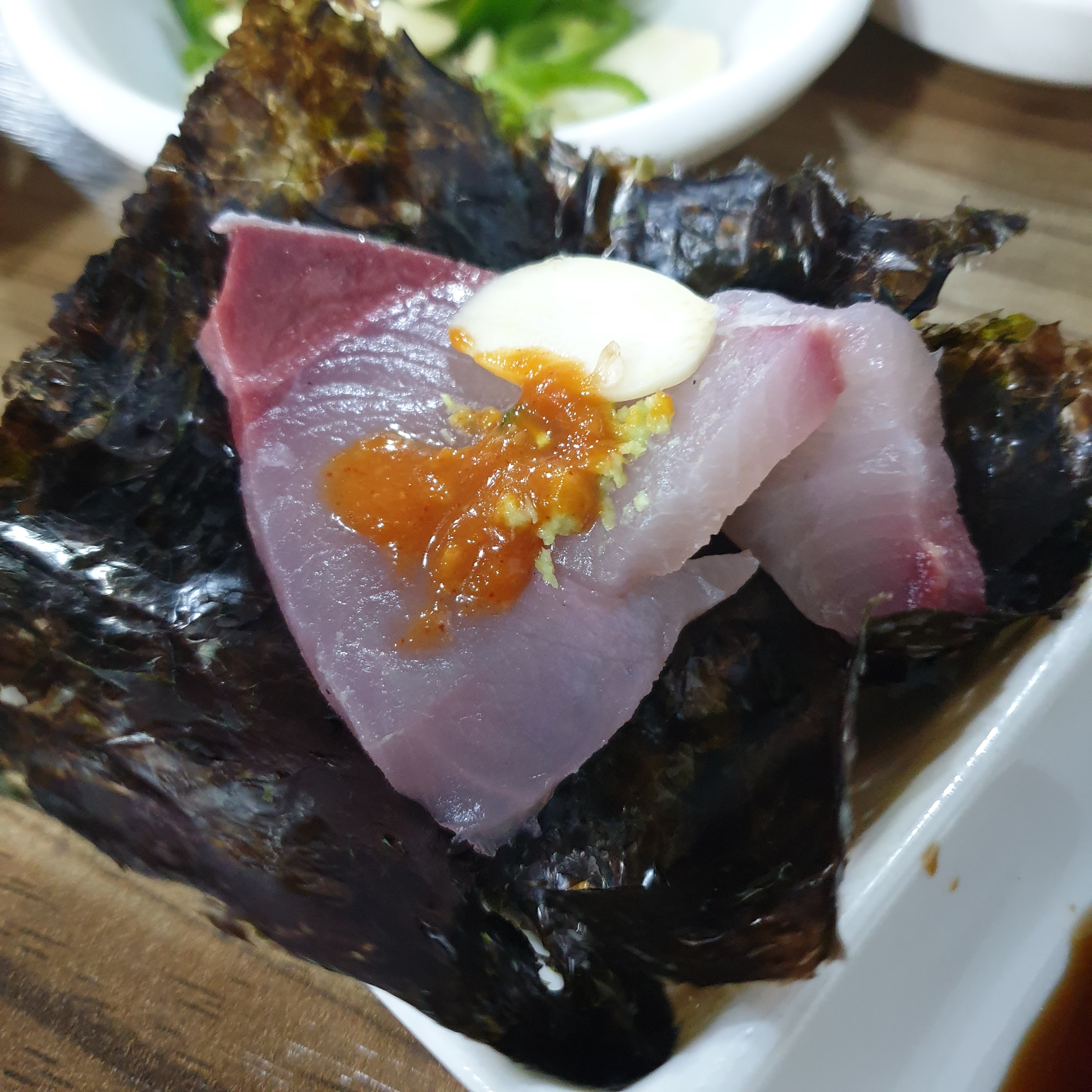 오늘회에서 방어 주문하면 기름장이 같이 오던데 여기는 따로 요청하니 주셨다. 촌스럽다고 할까봐 가능하면 가게에서 추천 하는대로 먹는 편인데, 방어에 기름장은 참기 힘들더라. 입장할 때 두 테이블 밖에 없었는데 7 전에 만석이 됐다.
