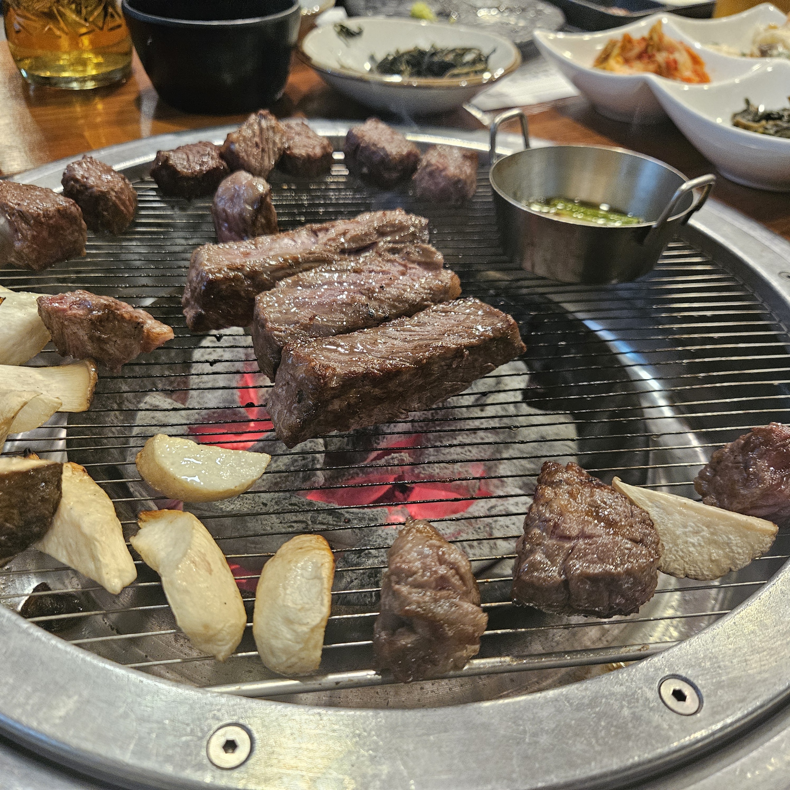 고기를 초반에 구워주시다가 나중엔 직접 굽는 시스템(?) 고기 굽는게 귀찮은 건 아닌데 비싼 고기니 기왕이면 잘 구워먹는 게 좋을 것 같아서, 나중에 추가 고기 가져오며 여쭤보니 두꺼운 고기는 even하게 굽기가 힘들어서 직접 구워주신다고 한다.